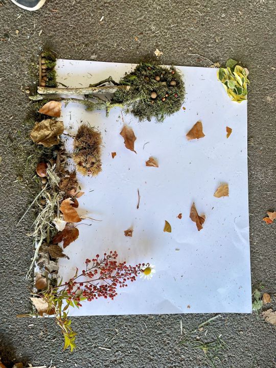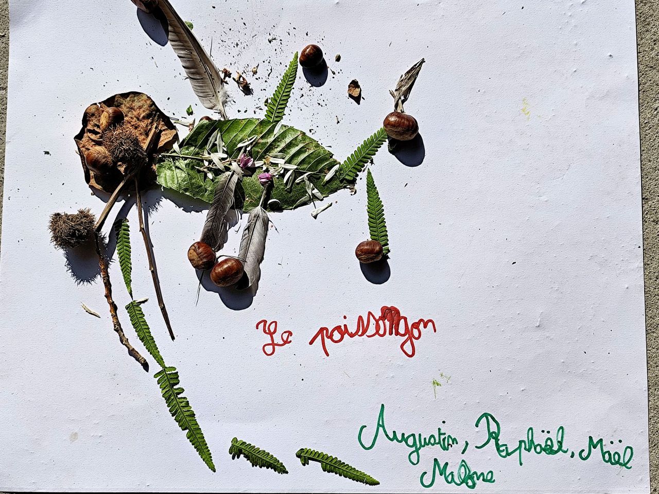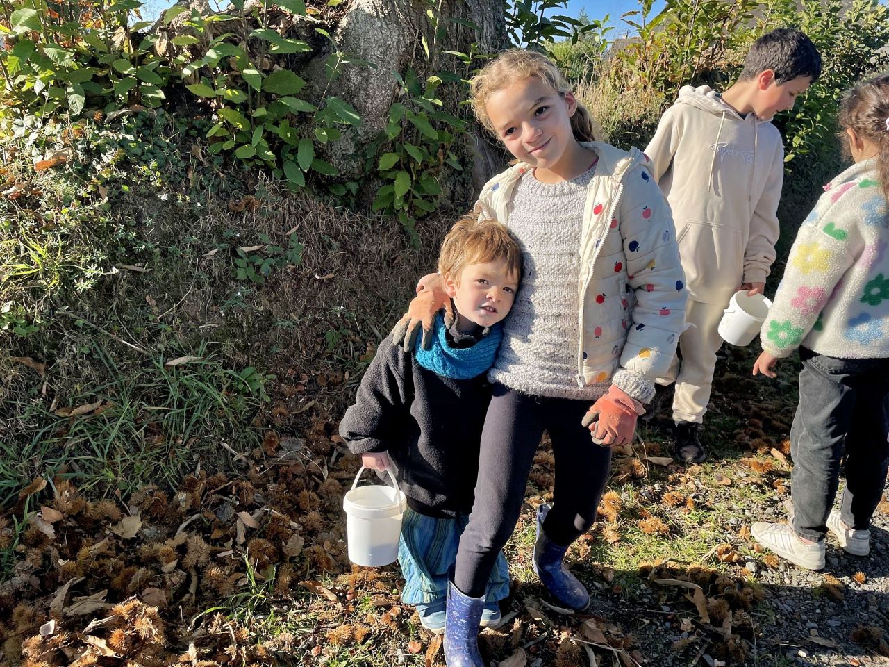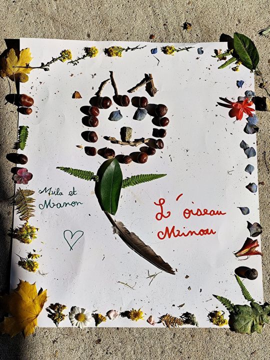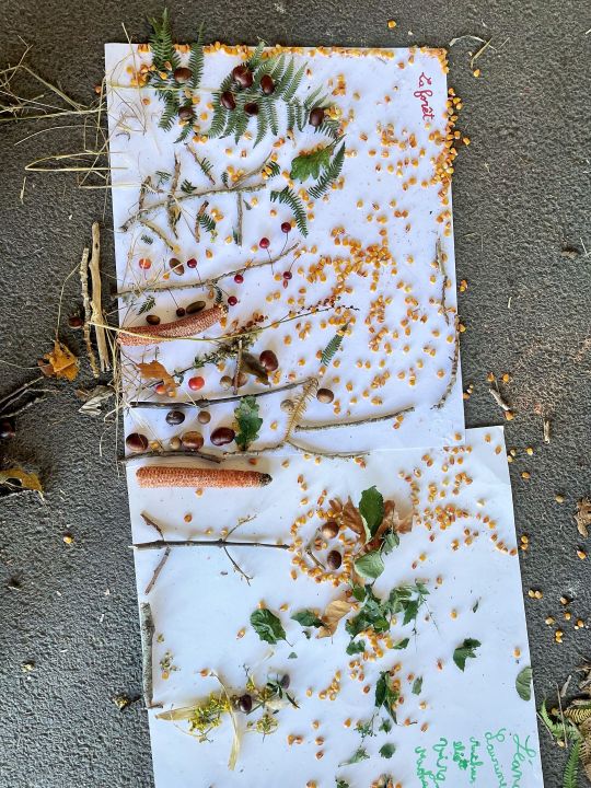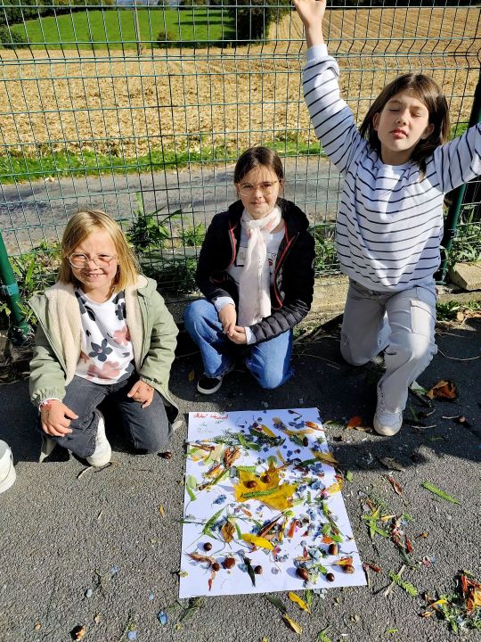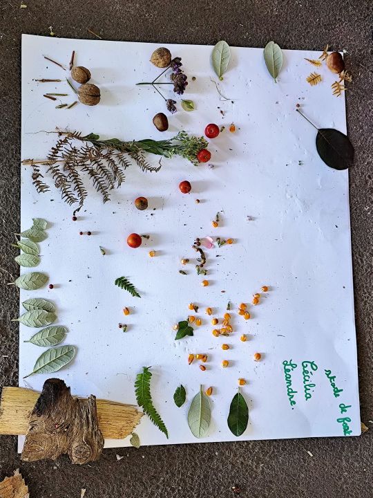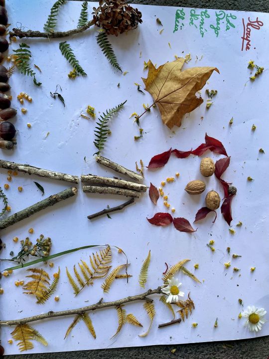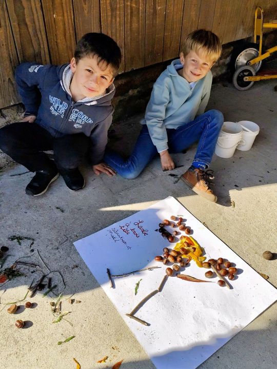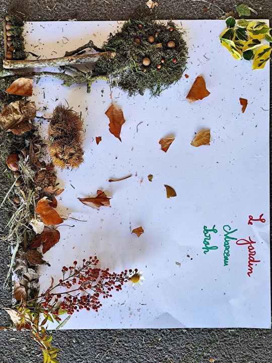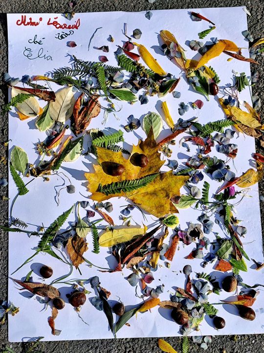 Jeudi 16 octobre, nous avons réalisé des œuvres en land art. Le lendemain, nous avons ramassé des châtaignes pour le pot.
